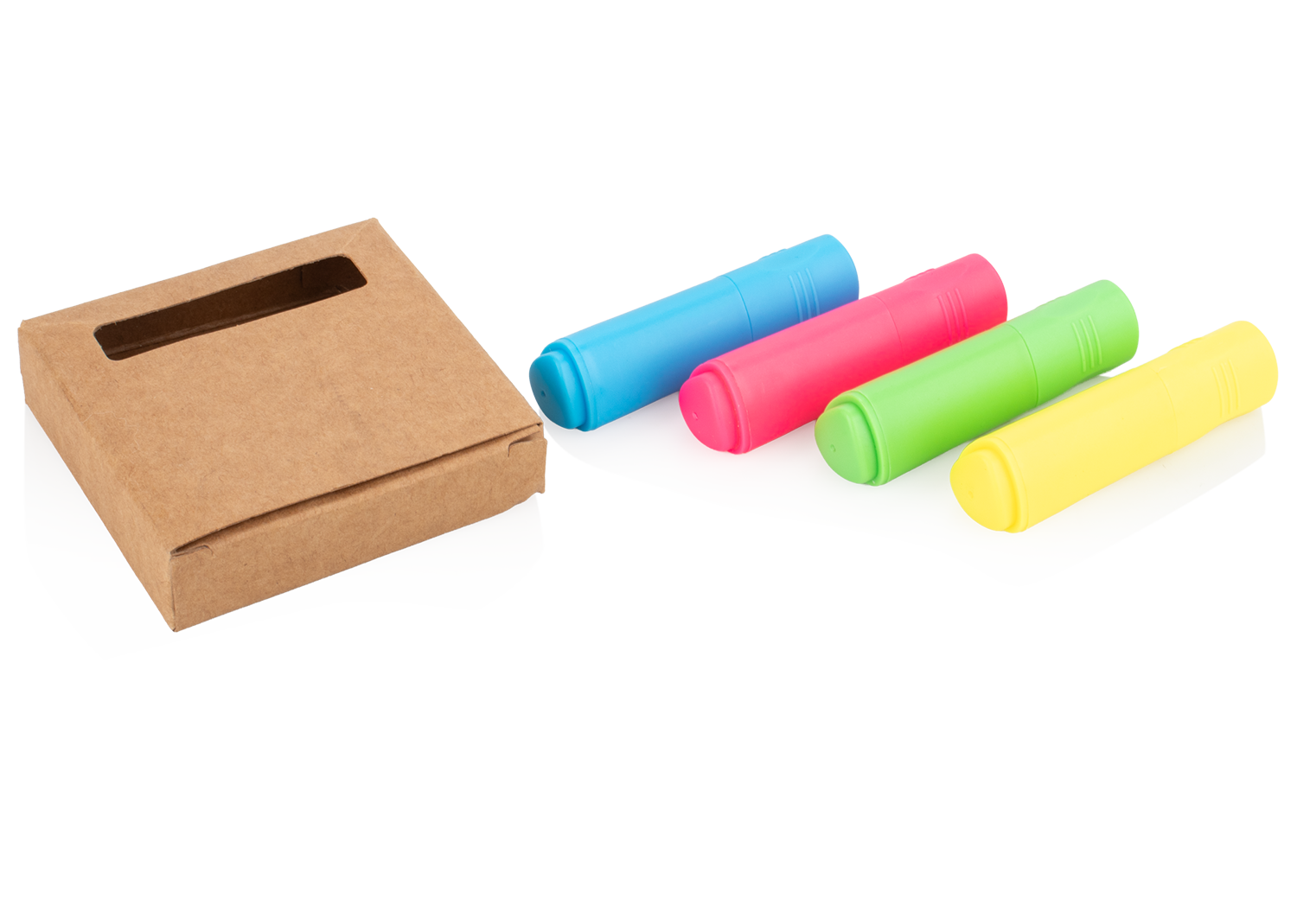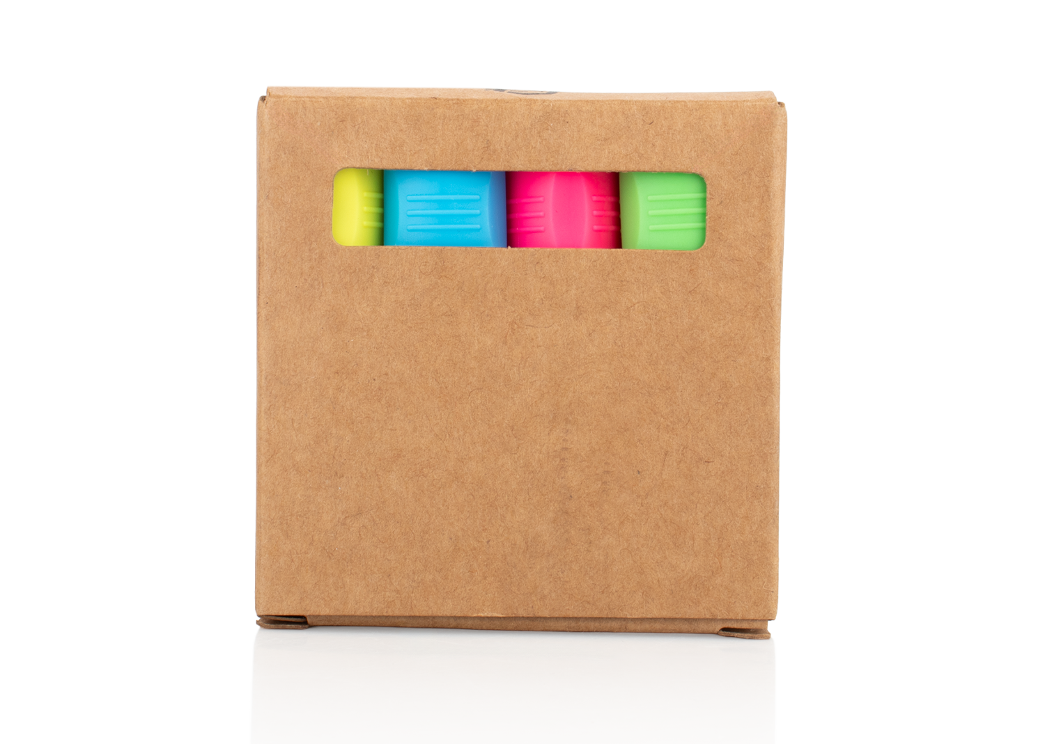 Este mini juego incluye cuatro resaltadores (7 X 1,7) en colores surtidos, presentados en una caja de carton con ventana que permite visualizar su contenido. Su tamano compacto los hace ideales para llevar en estuches o bolsos pequenos, ofreciendo una solucion practica para resaltar informacion en cualquier momento || Material: Polipropileno || Tamaño: 7 x 7.2 x 1.8 cm