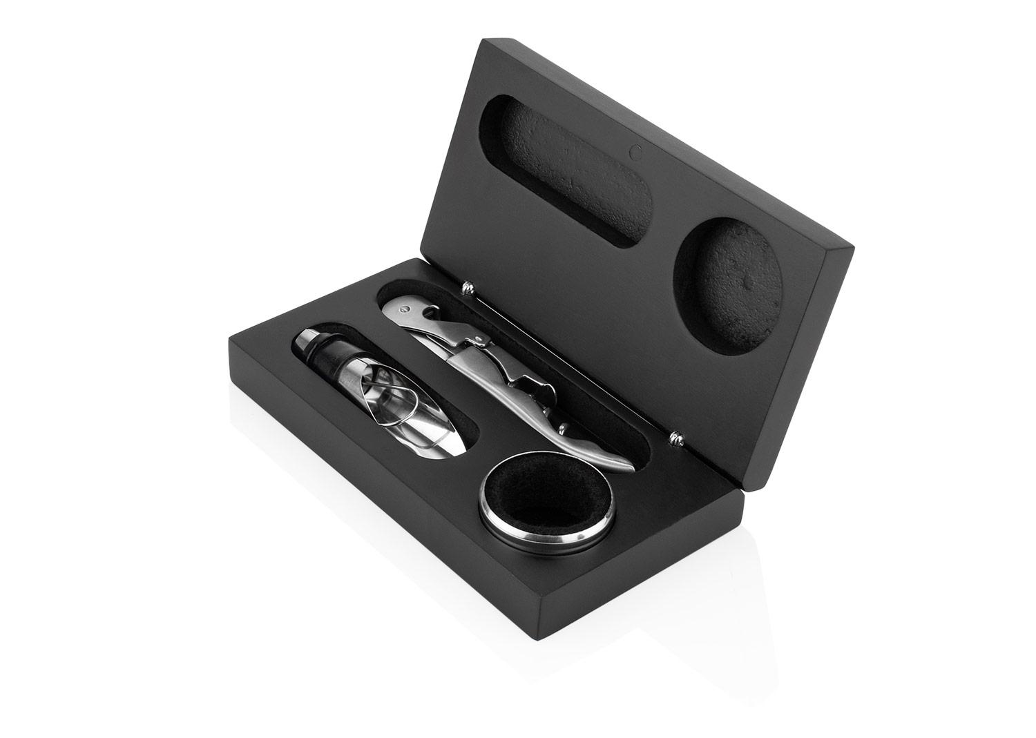 Set de vino elegante presentado en estuche rigido, ideal para regalo. Incluye sacacorchos metalico multifuncional que incluye una sierra (2,1 X 12 X 1,2), vertedor para botella (7,7 X Ø 2) y aro antigoteo (2 X Ø 3,9), disenados para facilitar el servicio y conservar la presentacion del vino. Un accesorio practico y sofisticado, perfecto para amantes del vino u ocasiones especiales || Material: Acero Inoxidable + Silicona + Madera || Tamaño: 15.4 x 3.3 x 8.4 cm