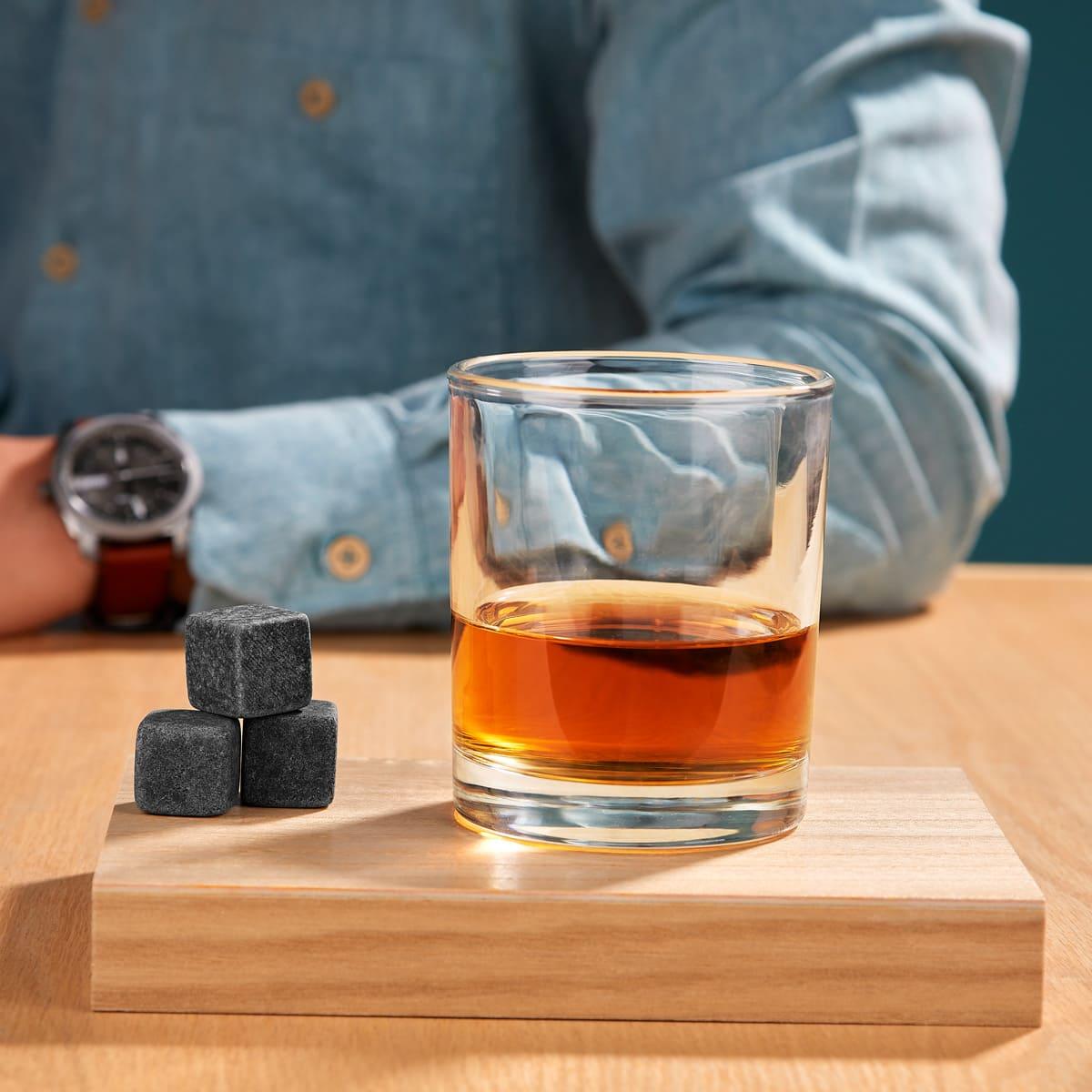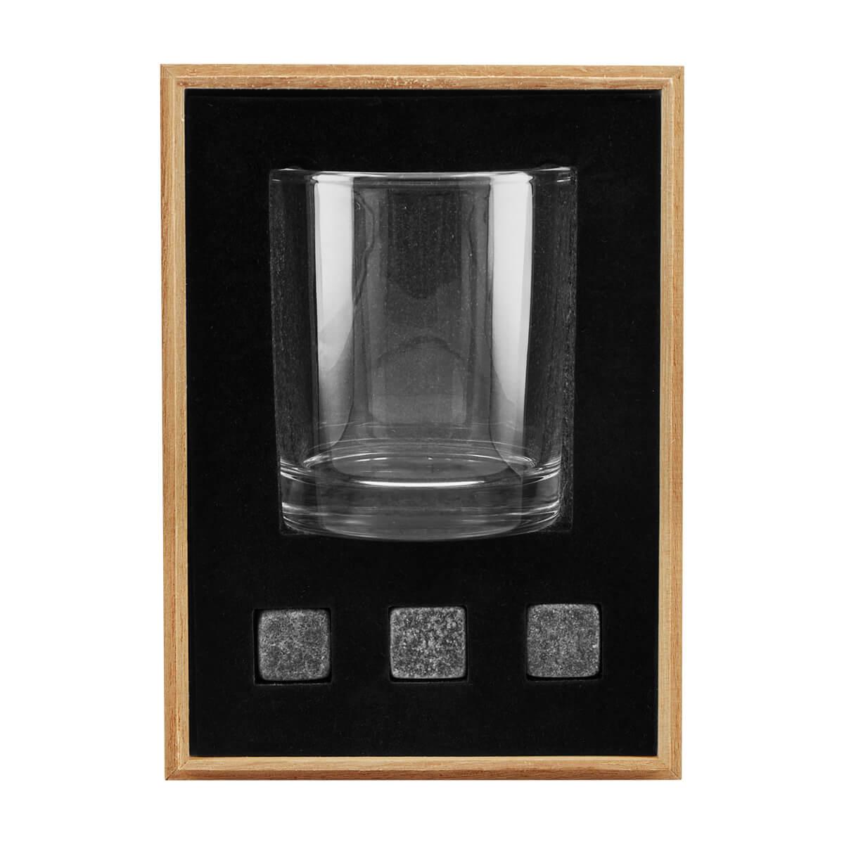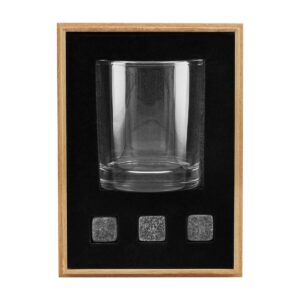 Set de bar. Incluye vaso de cristal, 3 enfriadores de piedra y estuche de madera || Material: Vidrio / Madera / Piedra || Tamaño: 13.3 x 18.2 x 9.8 cm Caja