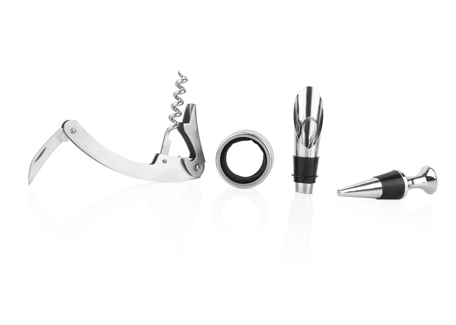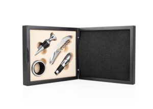 Elegante y funcional set de accesorios para vino, presentado en una caja negra con compartimentos individuales. Incluye: 1 tapon de vino en aleacion de zinc y silicona (7,9 X Ø 1,9), 1 sacacorchos de camarero en acero inoxidable (2,8 X 11,1 X 1,2), 1 vertedor de vino en acero inoxidable y silicona (7,7 X Ø 1,9) y 1 collar de vino en acero inoxidable (2 X Ø 3,9). Perfecto para regalar o complementar tu coleccion personal, este set combina estilo y practicidad para disfrutar del vino con clase || Material: Aleación de Zinc + Silicona + Acero Inoxidable || Tamaño: 15 x 17 x 4.5 cm