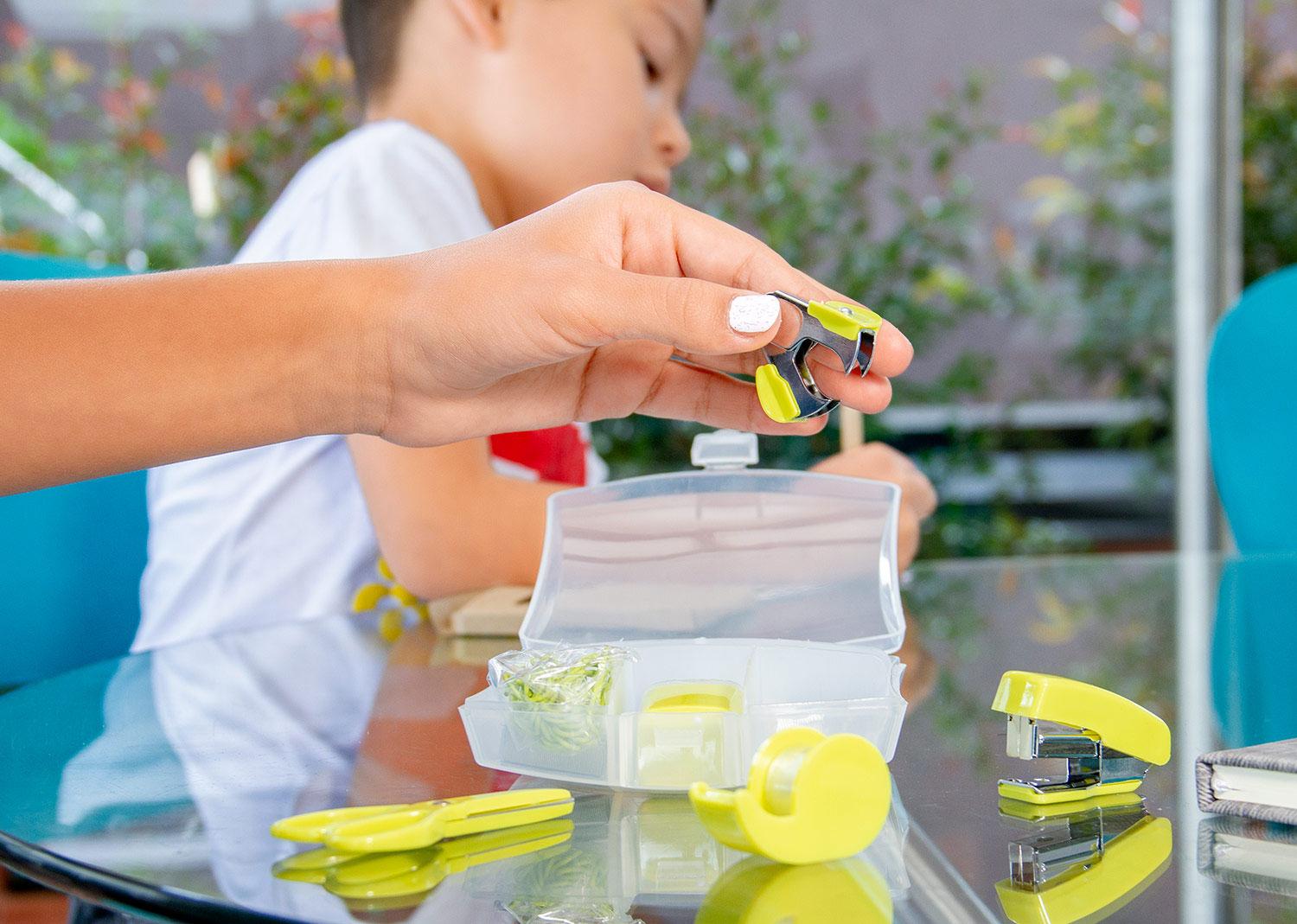 Practico estuche plastico que contiene 1 una cosedora, ganchos de repuesto x 5, dispensador de cinta adhesiva, rollo de cinta adhesiva de repuesto, clips de colores, saca-ganchos, tijeras, taja-lapiz || Material: ABS + PP + Metal || Tamaño: 10.50 x 10.50 x 2.50 cm