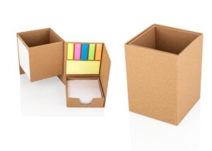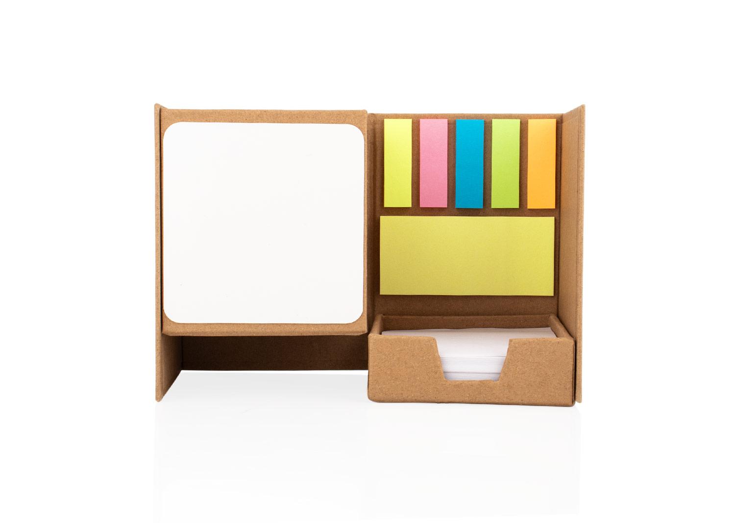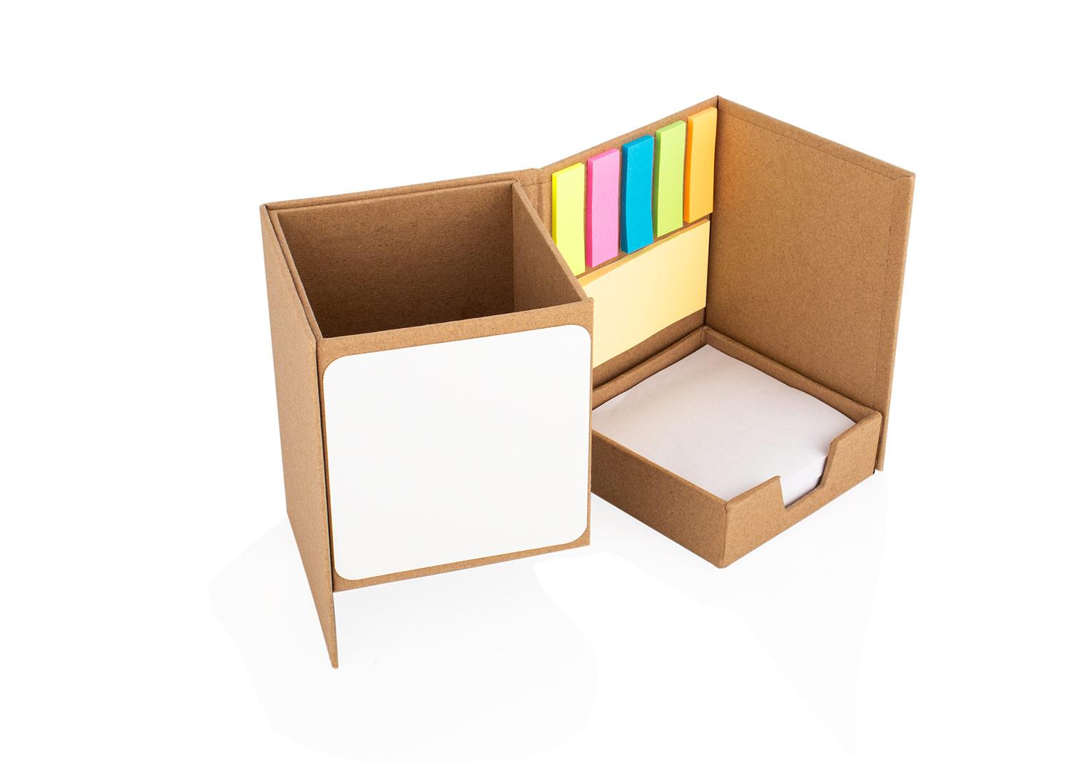Practico portaboligrafos multifuncional que incluye una pizarra blanca para apuntes rapidos, hojas blancas sueltas, notas adhesivas en un color y separadores adhesivos en cinco tonos diferentes para una organizacion mas visual. Su diseno permite abrir y cerrar el set de forma lateral, ofreciendo un uso comodo y compacto ideal para cualquier escritorio || Material: Papel endurecido || Tamaño: 8.5 x 11.4 x 8.5 cm