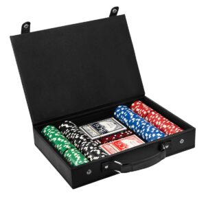 Set de juego con maletin. Incluye 200 fichas en 4 colores, perfectas para diferenciar valores o jugadores, 5 dados y 2 barajas plastificadas que ofrecen un deslizamiento suave, todo cuidadosamente organizado en un sofisticado maletin fabricado en material curpiel, que combina estilo y practicidad. Incluye caja individual || Material: PU Estuche / Plástico Fichas y Dados || Tamaño: 36.5 x 23.5 x 6.5 cm