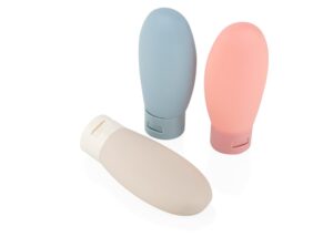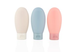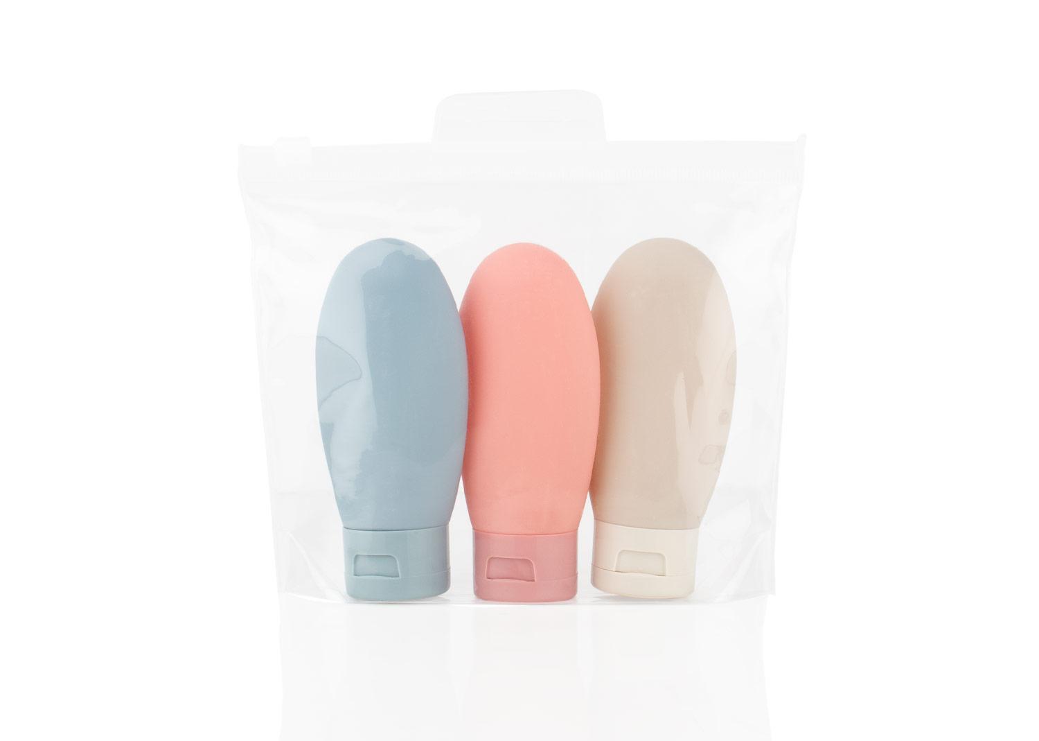 Set de botellas de viaje que incluye tres envases de 60 ml (5 X 10,8) con tapa de cierre a presion, ideales para transportar liquidos como shampoo, gel o locion; vienen en una bolsa transparente con sistema para colgar, lo que facilita su organizacion y acceso durante viajes o desplazamientos || Material: PP + PE + EVA || Tamaño: 17.8 cm de ancho x 16.6 cm de alto