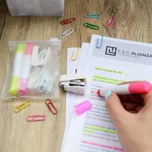 2 resaltadores de cera talla L, cosedora plastica, clips multicolores en bolsa PVC de cremallera plastica. Resaltador: 8.8 x 1.4 cm. Bolsa: 10.5 x 8.5 cm. Nota: El inventario corresponde a la bolsa con cosedora y clips de colores, para los resaltadores revisar inventario del Resaltador Wax individual. Los resaltadores pueden ser del mismo color o de dos colores. – Impresion: Tampografia Tamano Impresion: Bolsa: 6.5 x 6.5 cm / Resaltador: 3 x 0.7 cm – Caja: 49x30x26 cm. 300 unidades 12 KG