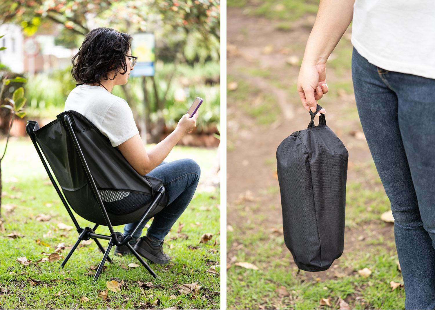 Silla plegable tipo camping, facil de transportar gracias a su diseno compacto y ligero. Cuenta con estuche incluido que permite guardarla comodamente cuando no esta en uso, ideal para actividades al aire libre. Peso maximo recomendado: 100 kg || Material: Poliéster 600D + Acero || Tamaño: 36 x 13.6 x 10.5 cm