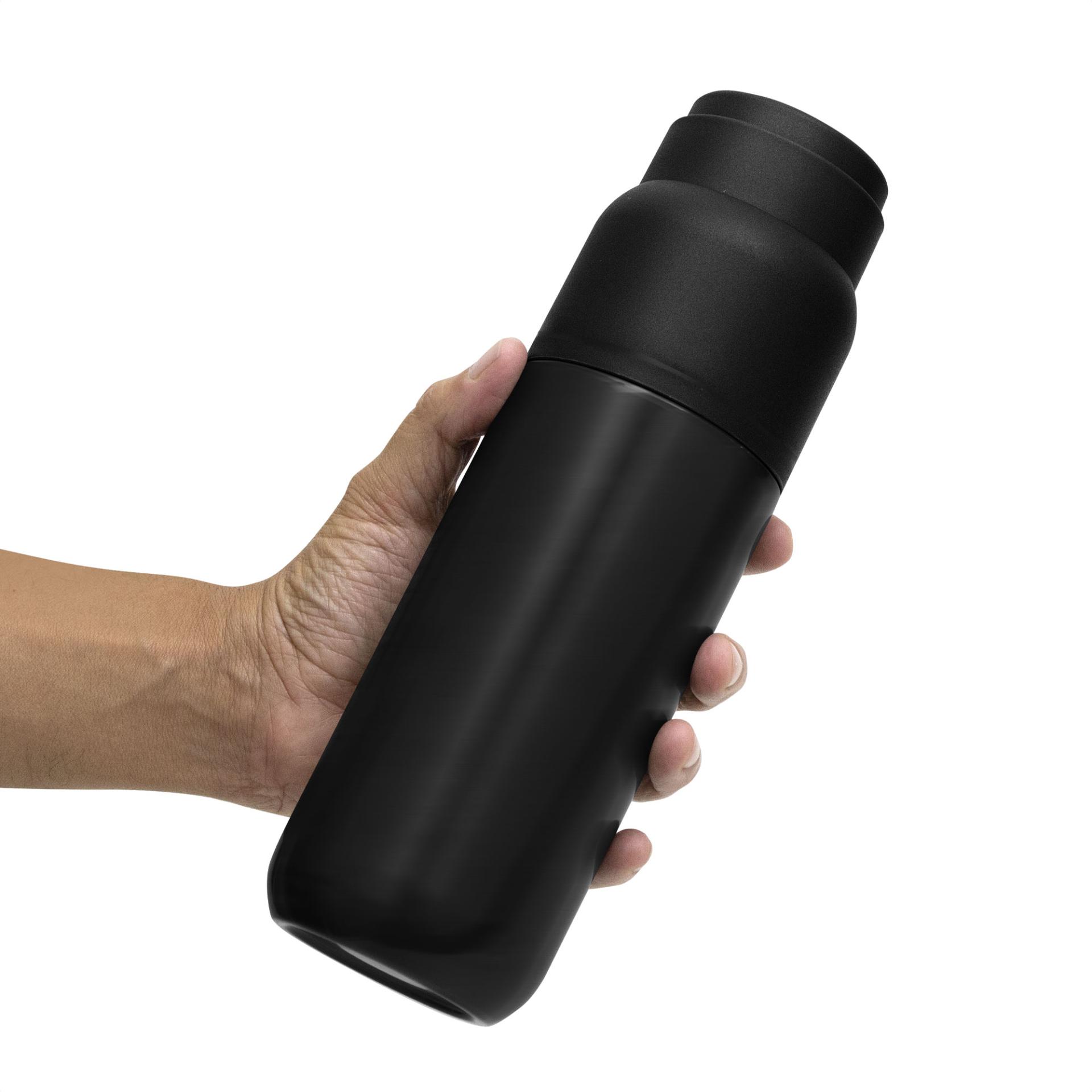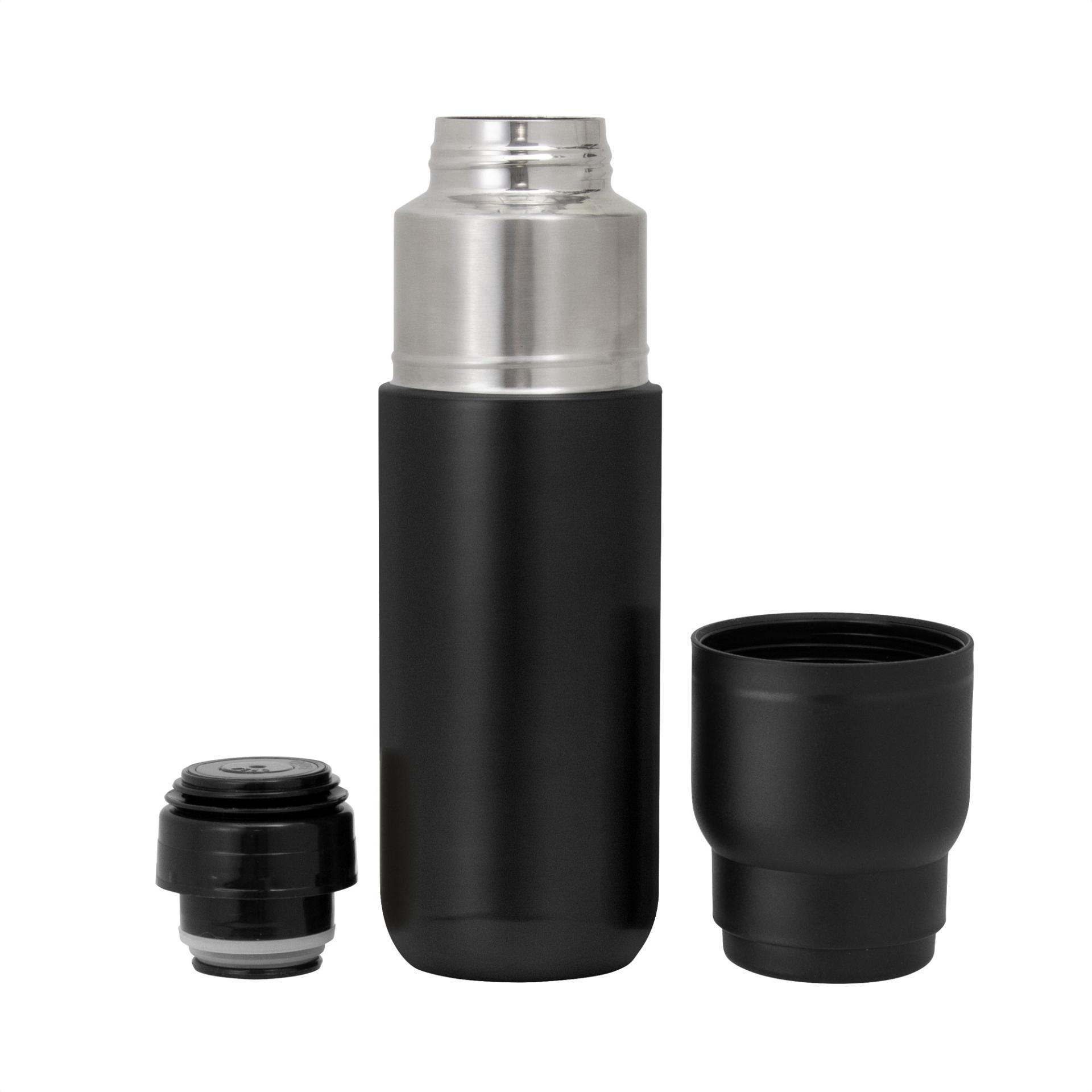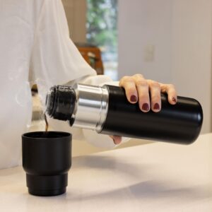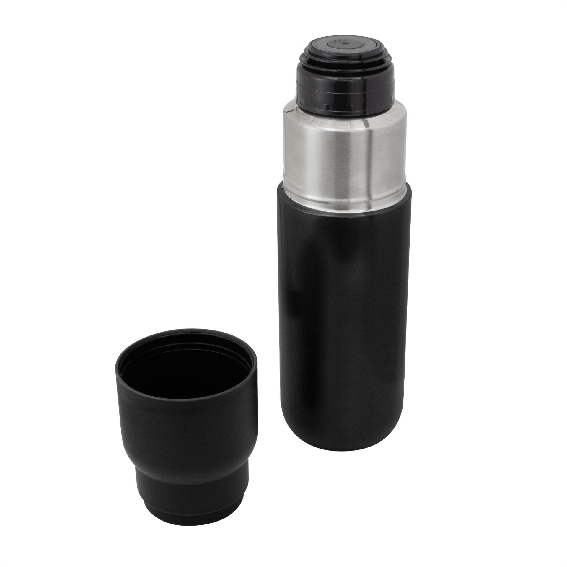 Fusiona el diseno compacto multiuso y el rendimiento prolongado.Termo con taza. Termo Doble pared sellado al vacio. Interior en acero 304 y exterior en acero 201. Tapa y taza plasticas a rosca color negro. Tapon con apertura y cierre a presion. Mantiene por mas de 12 hs la temperatura de las bebidas calientes y 24 hs de las bebidas frias. Medidas: Ø 7,2 x 24 cmCapacidad: 500 ml.Materiales: Acero inoxidable y Polipropileno.Presentacion: en caja de regalo kraft