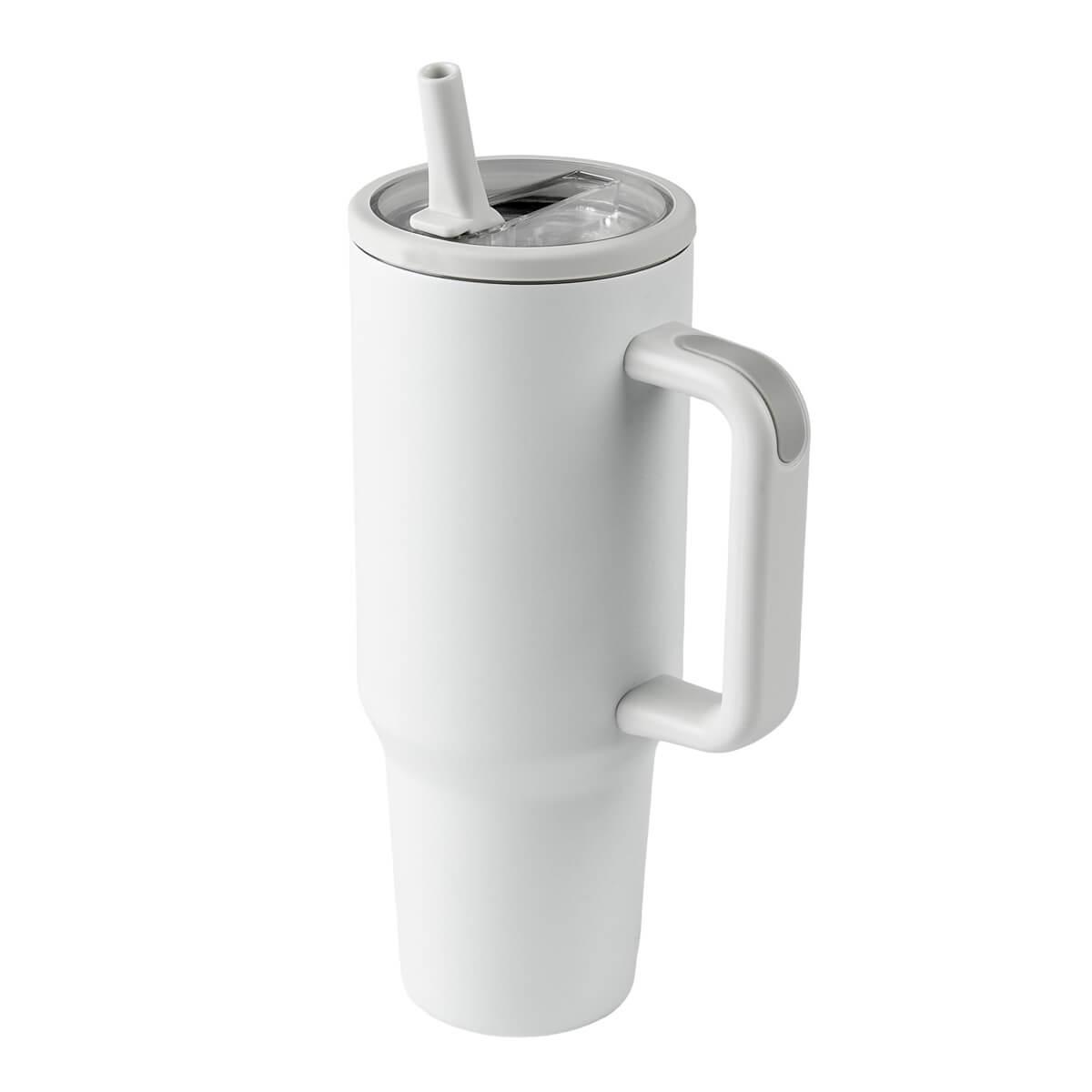 Termo doble pared. Cerrado al vacio. Pared interna y externa de acero inoxidable. Tapa de plastico con cierre de rosca que incluye boquilla con popote. Capacidad de 40 Oz. Base de 7.6 cm de diametro. Incluye caja individual || Material: Acero inoxidable / Plástico || Tamaño: 14.8 x 25.8 x 10 cm