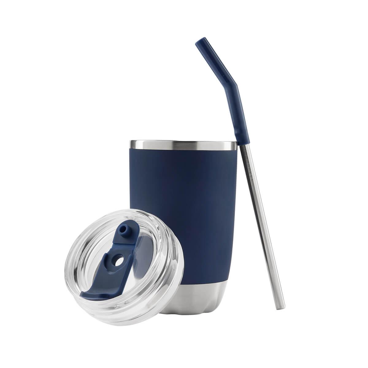 Doble pared. Cerrado al vacio. Pared interna y externa de acero inoxidable. Tapa push de plastico con sobretapa de silicon removible y ranura especial con tapon para popote. Incluye popote metalico con boquilla de silicon. Mantiene temperatura caliente 2 hrs y temperatura fria 8 hrs. Caja individual incluida || Material: Acero Inoxidable / Plástico / Silicón || Tamaño: 5 x 16 cm