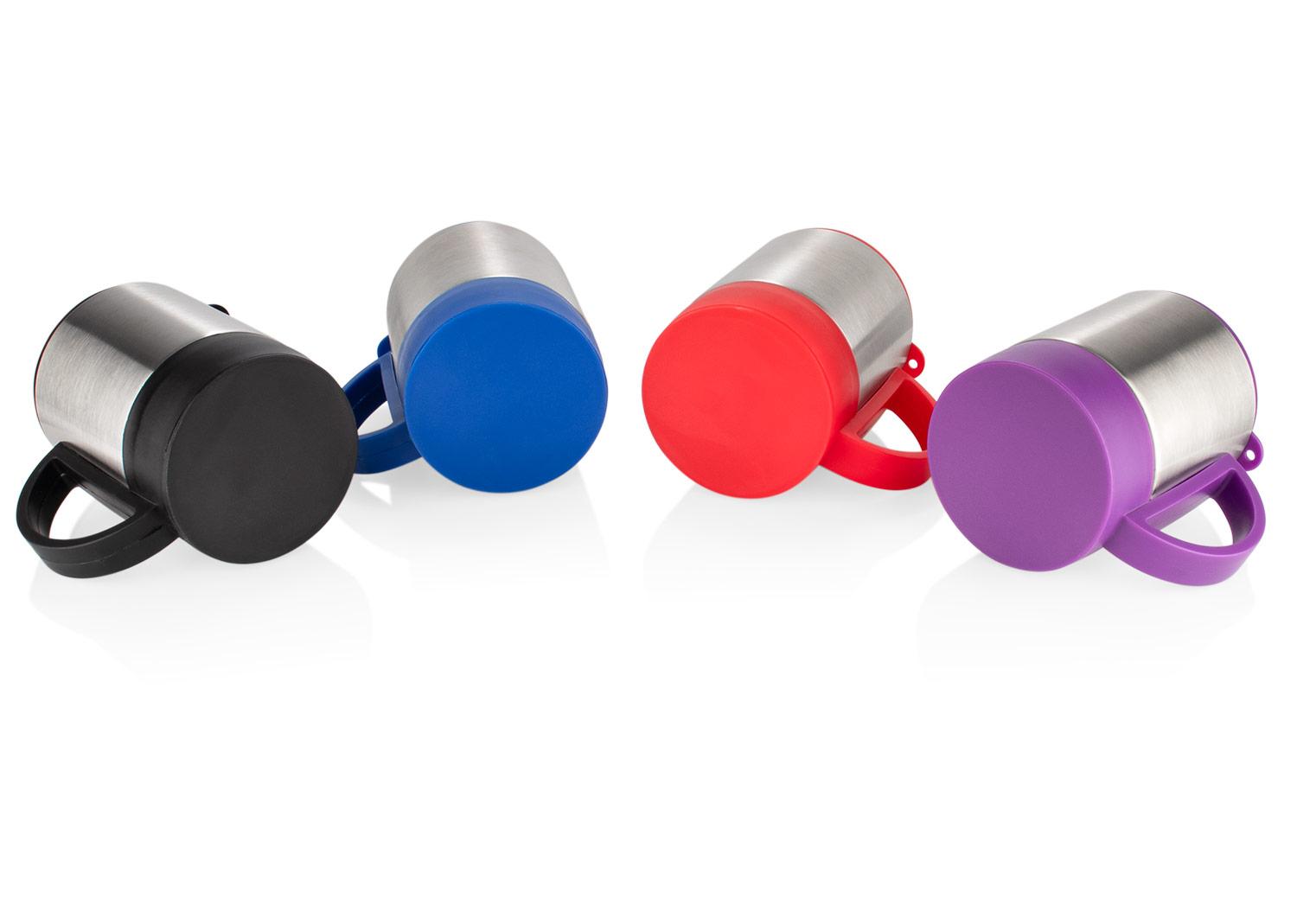 Mug termico con tapa de cierre bajo presion. Fabricado en acero inoxidable, con base y asa plastica para mayor comodidad. La tapa se ajusta firmemente mediante presion, ayudando a conservar la temperatura y evitar derrames. Capacidad: 150 ml / 5 Oz || Material: Acero Inoxidable 304 + PP || Tamaño: Diámetro de 6.7 cm
